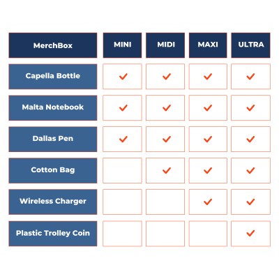 | Products Included: | Mini: Malta Notebook, Dallas Pen & Capella Metal Bottle, Midi: Malta Notebook, Dallas Pen, Capella Metal Bottle & Cotton Bag, Maxi: Malta Notebook, Dallas Pen, Capella Metal Bottle, Cotton Bag & Wireless Charger, Ultra: Malta Notebook, Dallas Pen, Capella Metal Bottle, Cotton Bag, Wireless Charger & Plastic Trolley Coin |