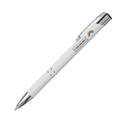 This stunning pen has a sleek white aluminium body with a rubber soft-touch grip, a blue ink jumbo cartridge, and silver clip, rings, and tip. You can choose from two vibrant designs: Rainbow or Heart and customise it with a full-colour print to 1 position.